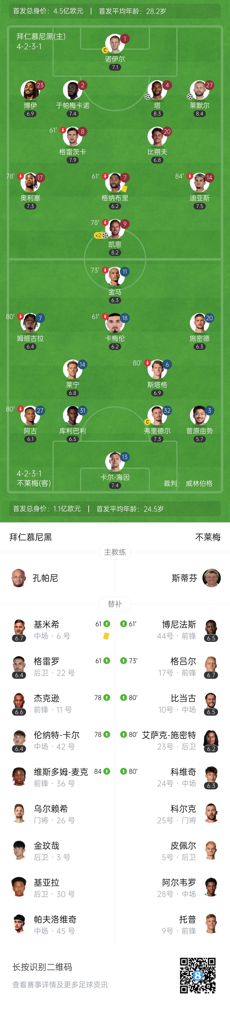 第65分钟,拜仁反击机会,左路迪亚斯禁区内突破分球,凯恩跟进包抄入网打进个人拜仁第100球,拜仁3-0领先↓