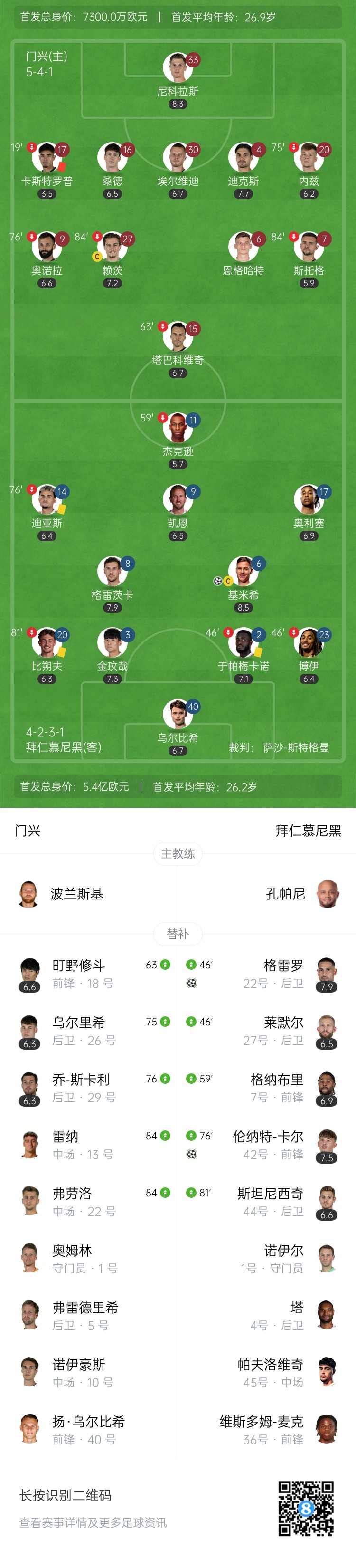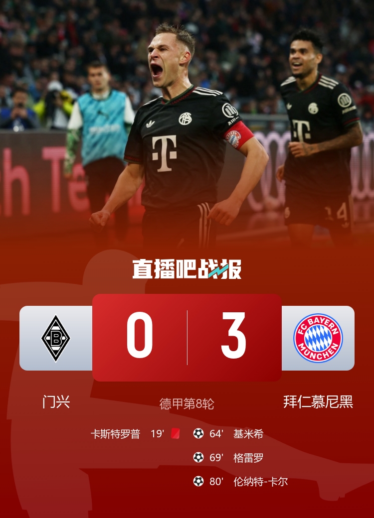 10月25日讯 北京时间21:45,德甲第8轮门兴格拉德巴赫vs拜仁慕尼黑。上半场,迪亚斯开场失单刀;卡斯特罗普飞铲迪亚斯染红;于帕梅卡诺离谱手球染黄!下半场,凯恩破门因越位无效,随后基米希、格雷罗破门;比朔夫送点,斯托格点射击中立柱!17岁卡尔替补登场世界波锁定胜局!最终,拜仁3-0击败十人门兴,8连胜领跑德甲!门兴则8轮不胜继续垫底。