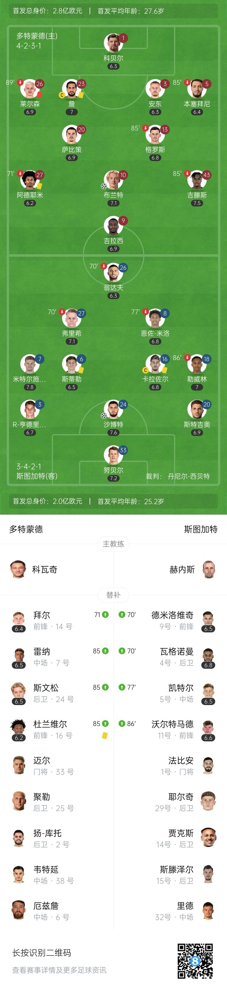 第85分钟,多特连换3人,雷纳、杜兰维尔、斯文松替补登场。↓