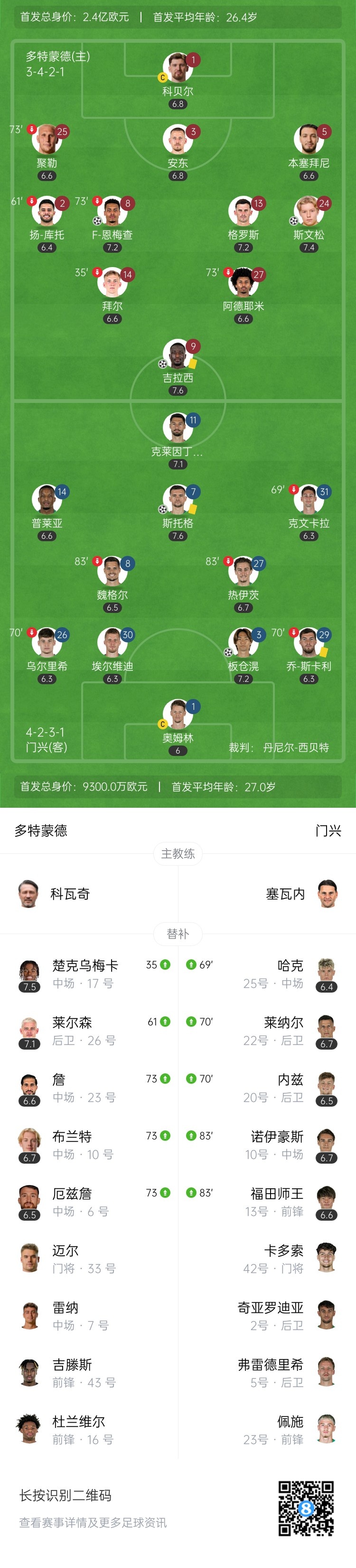 第45+4分钟,多特依旧是右路形成突破后横传中路,吉拉西禁区得球打门被扑,斯文松头球补射破门,多特蒙德3-1门兴。↓