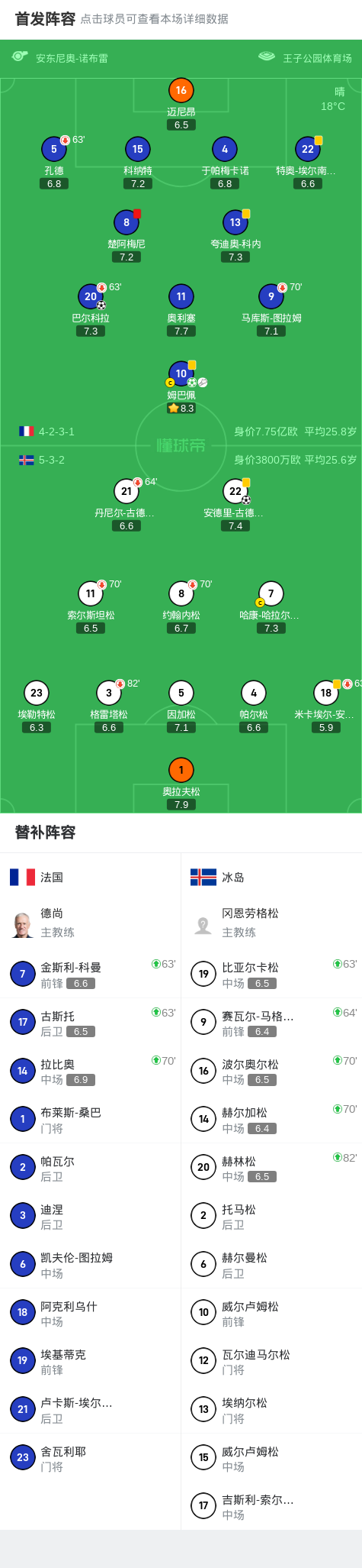 法国2-1冰岛,姆巴佩1传1射,巴尔科拉制胜,奥利塞失误送礼