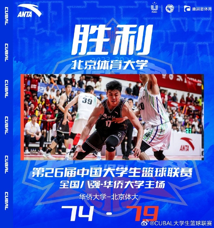 末节开局北京体大虽然外线依旧不准,但陈宇宸命中个人第三记、同时也是球队第三记三分,加上谢智杰的2+1进球,北京体大10-2开局直接拉开两位数分差占据绝对上风。大比分落后的华侨大学尝试抢三分但效果一般,抢分阶段虽然依托叶润峰的三分和李绪建的2+1追至8分但时间所剩不多。北京体大打得很乱但胜在优势大容错率高,最后华侨大学不断抢三分但时间已经不够创造神奇。最终,北京体育大学79-74力克华侨大学拿下比赛。