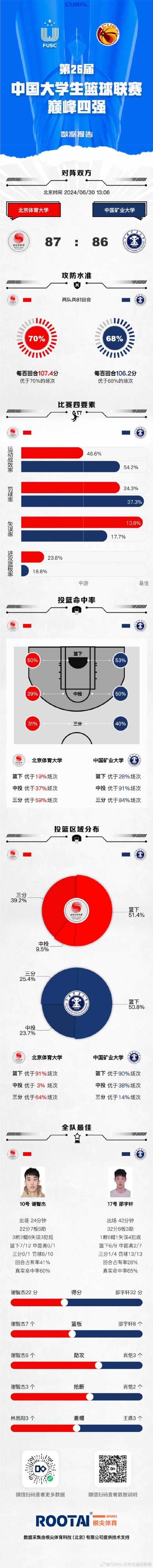 北体大:谢智杰22分7篮板6助攻3抢断2盖帽、杨腾飞16分5篮板、陈宇宸11分2助攻、潘睿彦12分6篮板、林思阳13分3盖帽、胡博8分2篮板