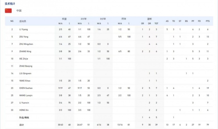 中国大学生男篮数据:陈国豪19分7篮板1助攻,邹阳13分7篮板1抢断,王岚嵚10分3篮板4助攻,黎伊扬6分5助攻3篮板1抢断,祝铭震2分4篮板1抢断,张宁11分4篮板1助攻,谢智杰3分2助攻1盖帽,杨曦皓2分1篮板,李苑鑫7分2篮板,洪辛6分2篮板1抢断