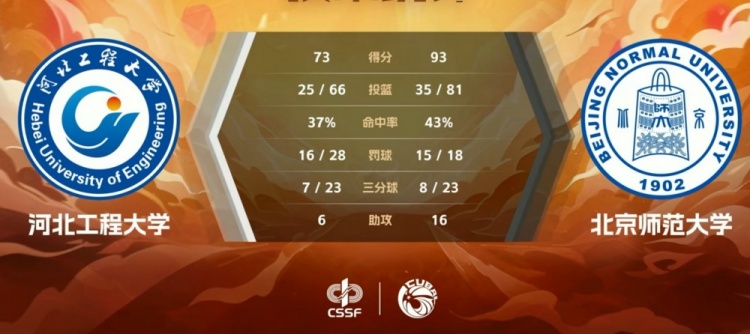 末节比赛,北京师大抢断发球后反击得手,吴士广5犯离场,但北京师大多点开花牢牢占据场上主动,肖洋延续火力,河北工程不断冲击篮筐造成杀伤但6罚仅2中,北京师大轻松将优势保持到最后。最终,北京师大93-73击败河北工程大学。