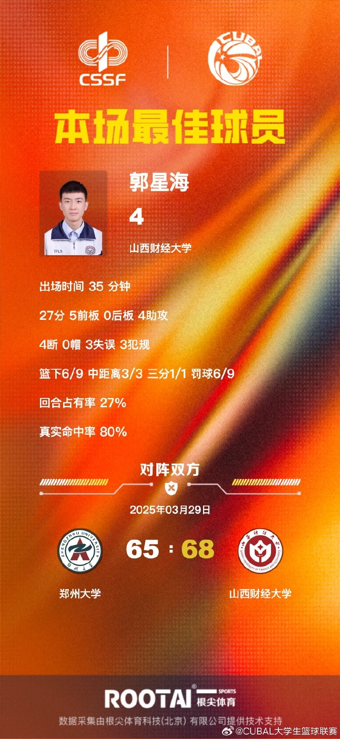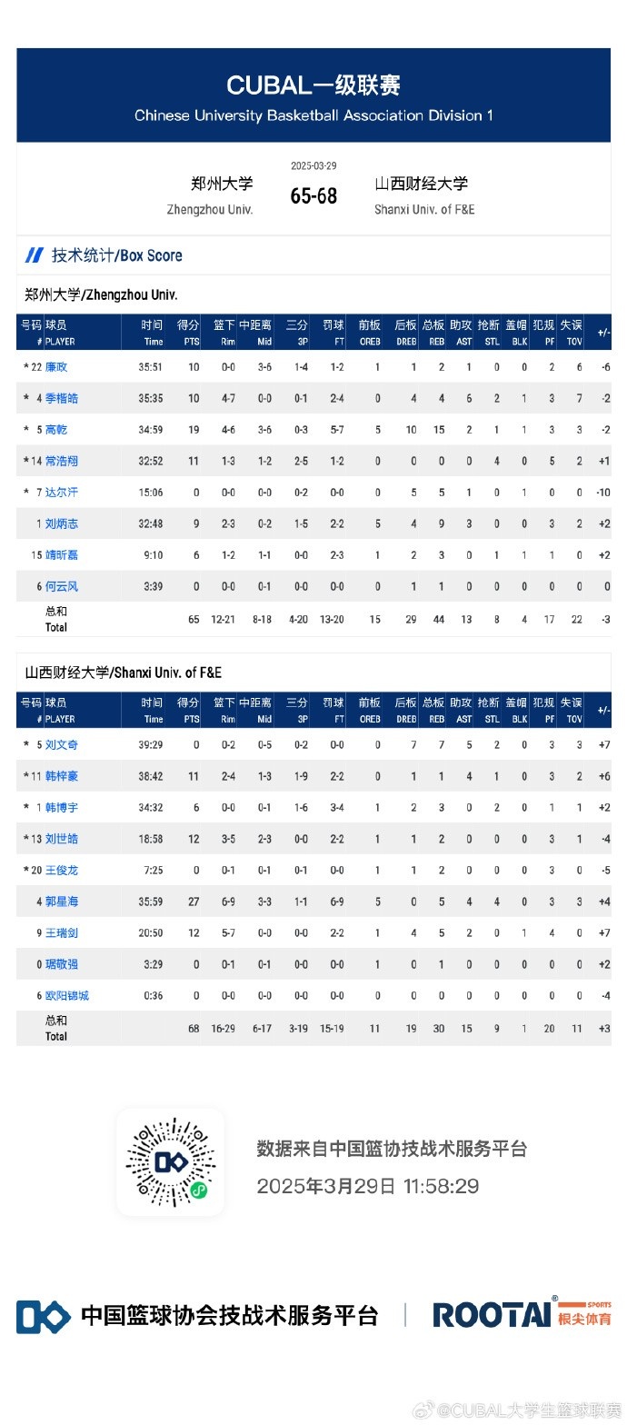🏀CUBAL排位赛-郭星海27+5 高乾19+15 山西财大力克郑州大学