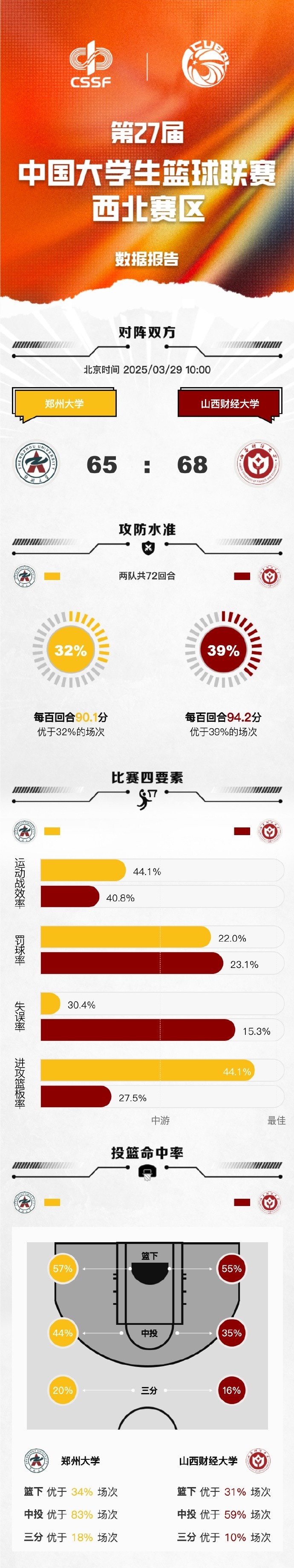 末节决胜山西财大稳定拿分一直确保领先,郑州大学则一直被动追分,刘炳志的三分和高乾的高位跳投得分虽然为他们咬住比分但却始终无法更进一步。最后决胜时刻手握8分的山西财大突然哑火且连续出现失误,季楷皓和高乾的连续拿分将劣势缩小至1分突然看到希望。读秒阶段郑州大学错失致命防守篮板,郭星海顶住压力两罚全中确保山西财大三分领先并奠定胜局。最终,山西财经大学力克郑州大学顺利晋级。