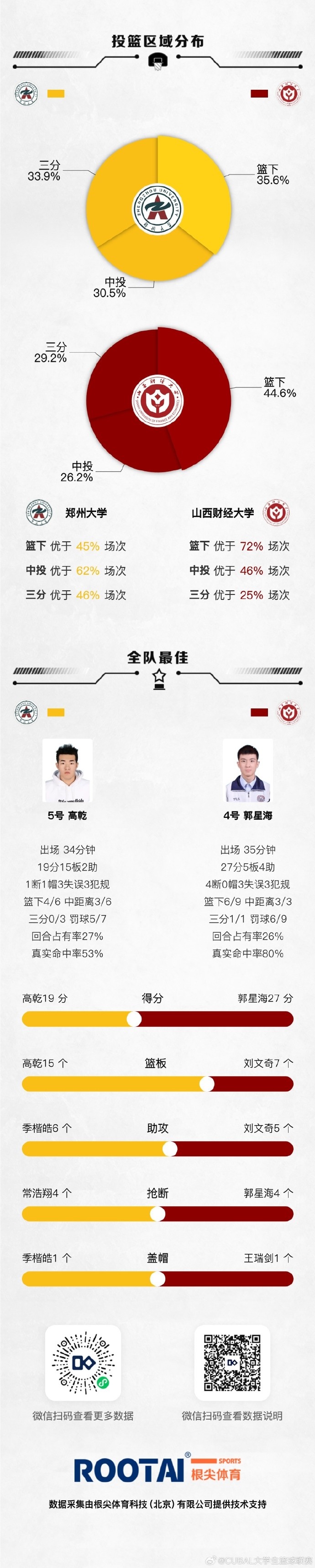 郑州大学:高乾19分15篮板2助攻、廉政10分2篮板、季楷皓10分4篮板6助攻2抢断;常浩翔11分4抢断、刘炳志9分9篮板3助攻、靖昕磊6分3篮板。