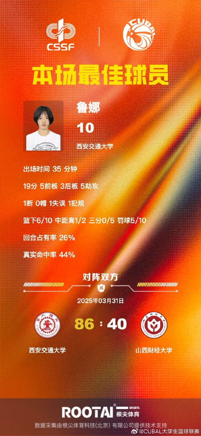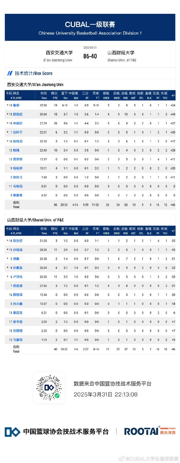 末节大局已定,西安交大也开始走马换将,山西财大压力骤减的情况下也逐渐稳定拿分,孙晓涵开局命中三分打开局面,不过整体上西安交大仍然占据绝对上风并继续扩大领先优势。最终,西安交通大学86-40大胜山西财经大学夺得西北赛区女子组冠军。