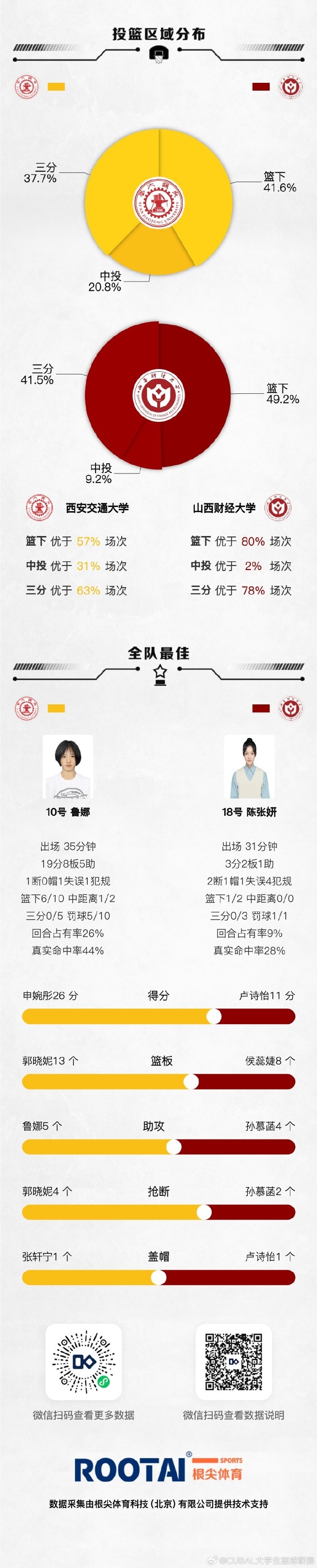 西安交通大学:申婉彤26分9篮板3助攻2抢断、郭晓妮15分13篮板3助攻4抢断;鲁娜19分8篮板5助攻、张轩宁6分5篮板、韩晴10分4篮板3助攻2抢断、赵晗羽3分6篮板、杨栋婷4分2篮板2助攻、陈屹戈3分2篮板。