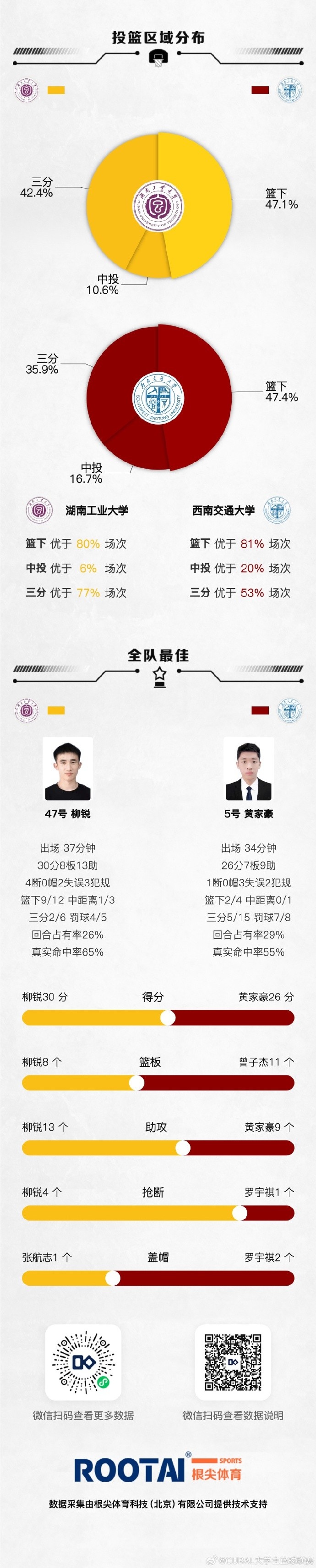 西南交通大学:黄家豪26分7篮板9助攻、潘哲远20分5篮板3助攻、罗智健16分4篮板、曾子杰8分11篮板4助攻、罗宇祺10分7篮板2封盖、王楷烨5分4篮板2助攻。