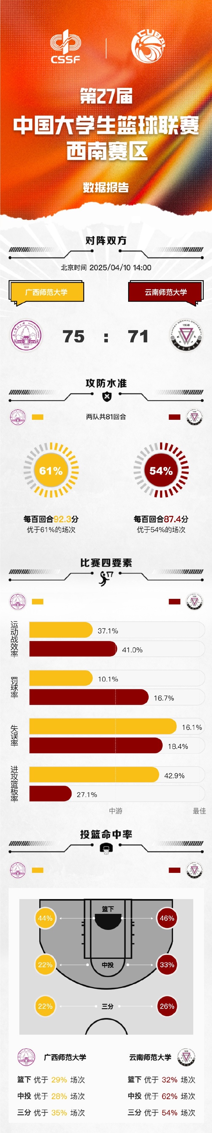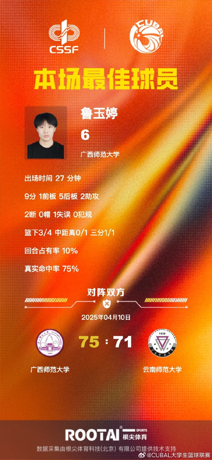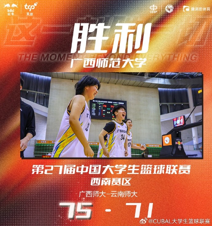 末节开局云南师大终于在被动下追上比分,娜汉和邱雪相继命中三分带队送上11-3的攻势实现反超。罗欣和卢嘉欣随后两记至关重要的三分进球为广西师大破荒,广西师大随后找到感觉依靠罗欣和邓嵌纹的篮下得分送上一波12-2的攻势重新取得领先并奠定胜局。最终,广西师范大学75-71力克云南师范大学拿下比赛。