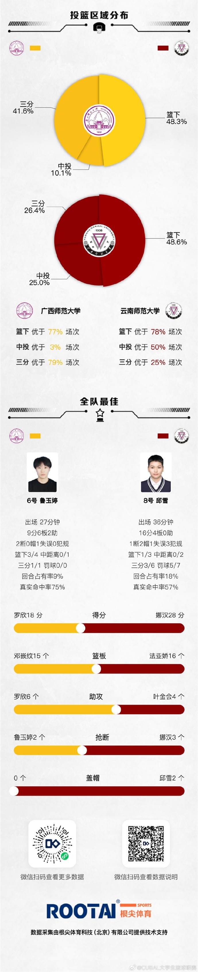 云南师范大学:娜汉28分8篮板4助攻3抢断、法亚娇12分16篮板2抢断、邱雪16分4篮板2封盖、叶金会7分7篮板4助攻、李安慈8分7篮板2抢断。