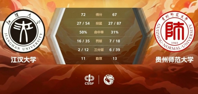 最后一节,两队手感还是比较一般,贵州师大依旧靠拼出来的二次进攻机会努力追分,邓志浩和刘彬轮番拿分帮助江汉大学保持领先优势。贵州师大最后时刻连续抢分但无奈时间所剩无几,全场比赛结束,江汉大学72-67击败贵州师范大学。