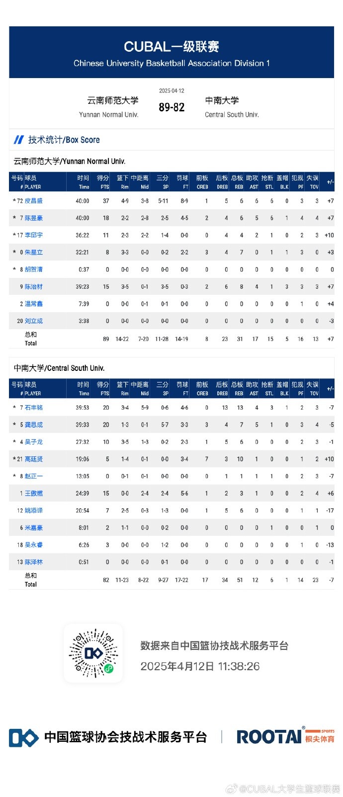 🏀CUBAL-皮昌盛37+6+6 石丰铭20+13 云南师大力克中南大学