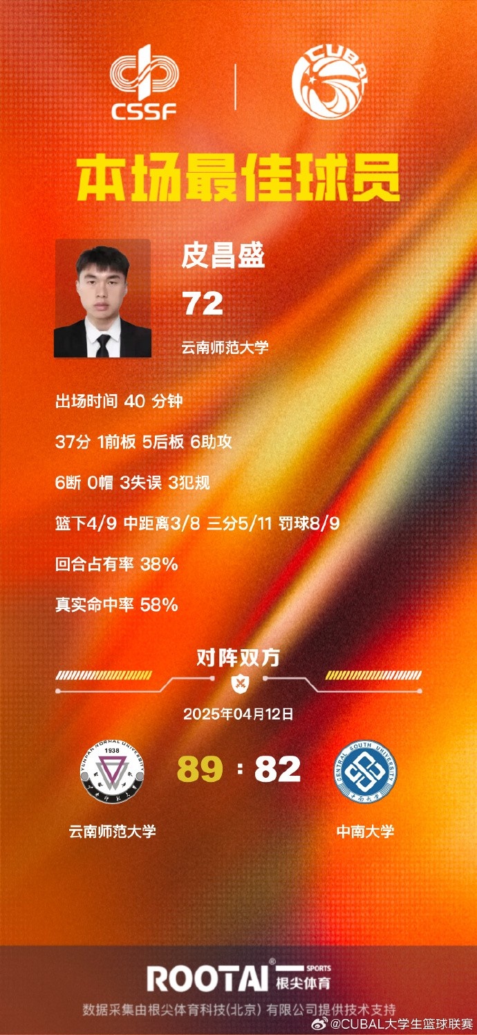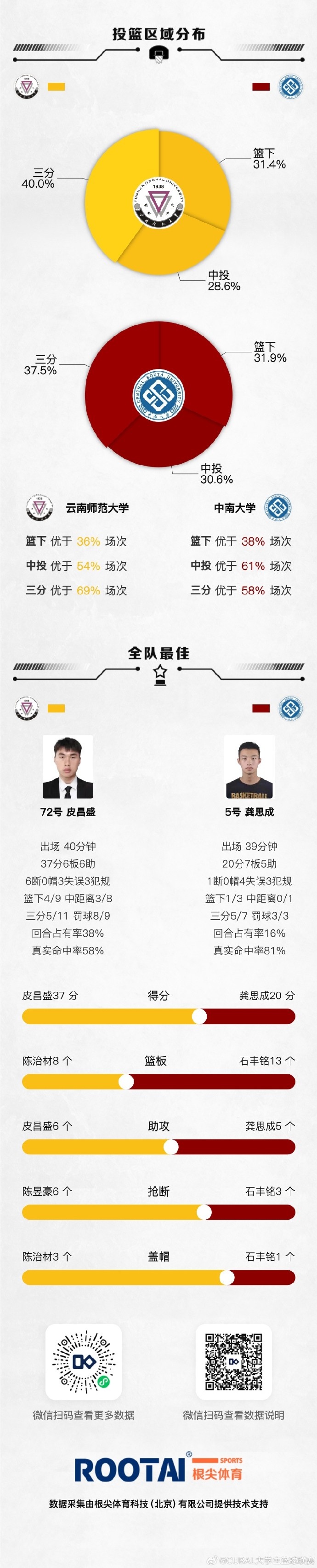 云南师范大学:皮昌盛37分6篮板6助攻、陈昱豪18分6篮板5助攻6抢断、陈治材15分8篮板4助攻3封盖、李邱宇11分4篮板2助攻、朱星立8分7篮板。