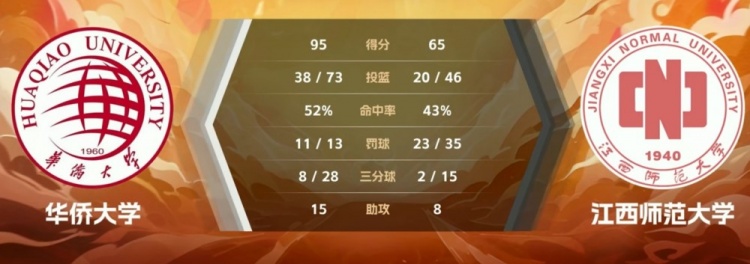 末节比赛,双方的进攻表现依旧不算好,半节过后两队一共只拿到10分,不过由于分差一直保持在三十分左右,比赛早已失去悬念,场上球员也打得相对放松,最终华侨大学95-65大胜江西师大。