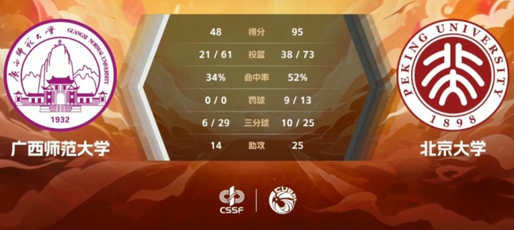 末节北京大学手握巨大优势但表现依旧出色,钱媛媛和李若莹联手命中三记三分,北京大学又是一波17-8的攻势将优势扩大至40分以上,这之后时间所剩不多场面也以练兵打完。最终,北京大学95-48大胜广西师范大学迎来3连胜。