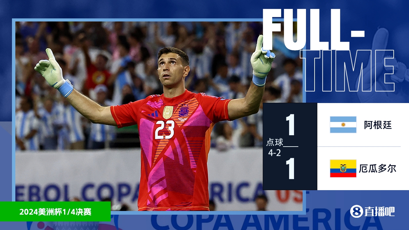 7月5日讯 美洲杯1/4决赛,阿根廷对阵厄瓜多尔。上半场,利桑德罗头槌首开纪录。易边再战,德保罗送点,瓦伦西亚失点,凯文-罗德里格斯补时绝平。双方直接进入点球大战。点球大战梅西失点,大马丁两次扑点,最终,阿根廷点球大战淘汰厄瓜多尔晋级四强,将对阵委内瑞拉和加拿大的胜者。