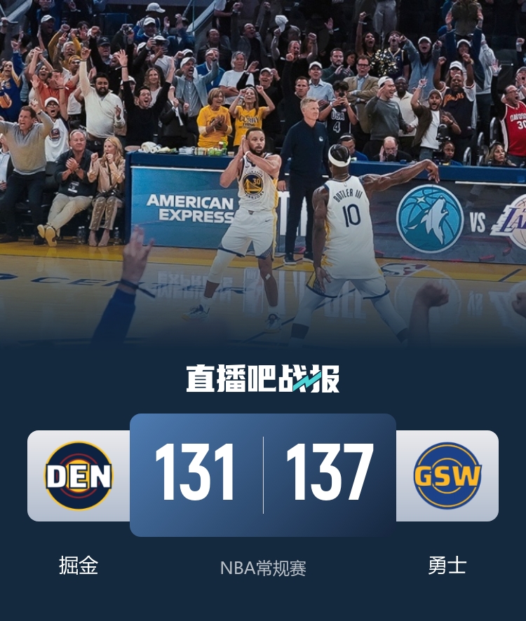 🏀库里42+6+7 戈登新高50+8 约基奇三双 勇士7人上双加时胜掘金