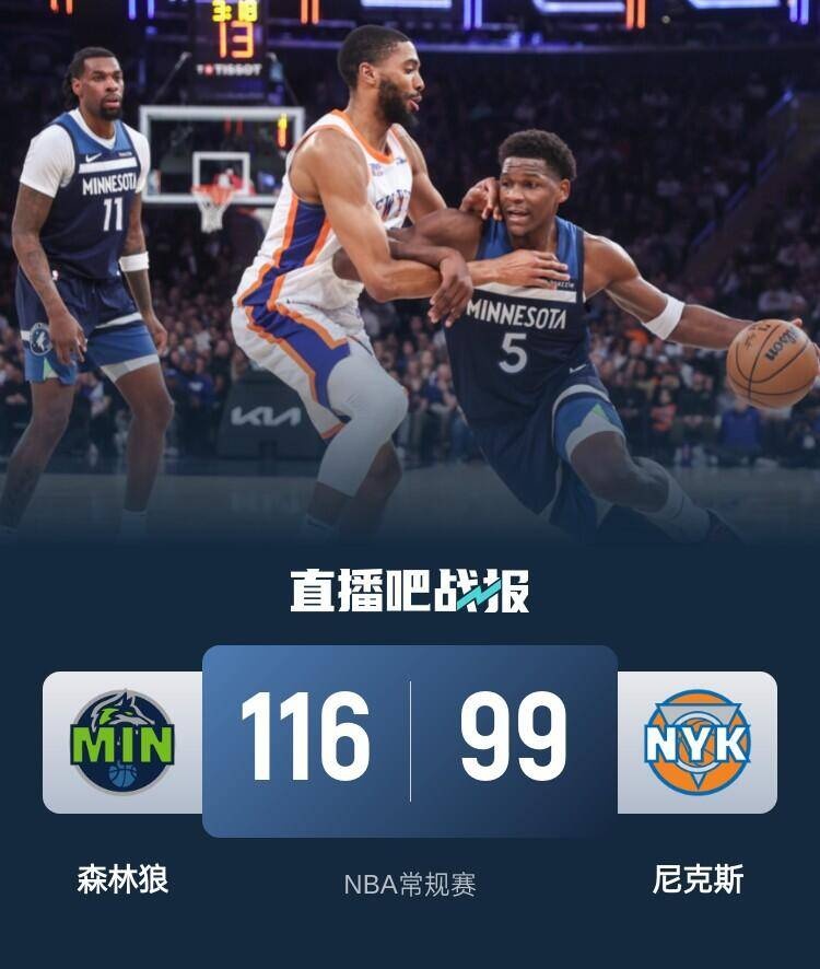 🏀爱德华兹36+13+7 里德三分6中6 唐斯缺战旧主 森林狼胜尼克斯