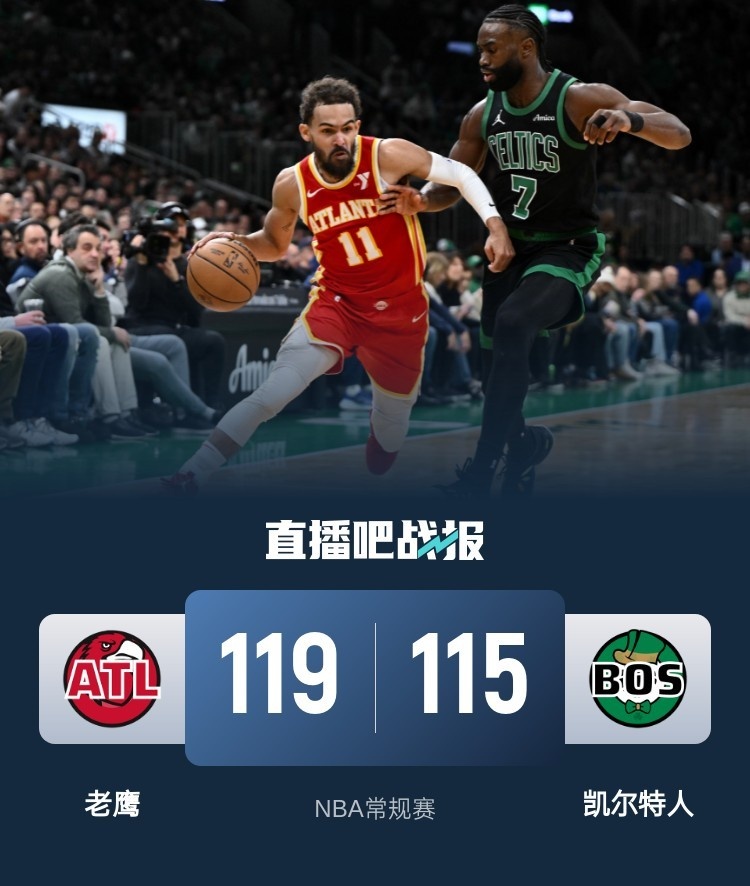 加时赛双方交替拿分几次互换领先,末段双方更是弹无虚发各种神仙球,不过最后时刻布朗先是被帽,随后又出现失误,老鹰则依靠奥孔武最后的进攻篮板罚球奠定胜局。最终,老鹰加时力克凯尔特人拿下比赛。