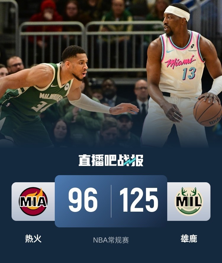 一开场,雄鹿手感冰凉,热火打出13-3的攻势取得两位数领先,字母哥高效输出带队迅速迫近比分,次节雄鹿全面回暖,单节轰下44分净胜热火19分,利拉德1秒内连投带罚收获6分,半场战罢雄鹿71-55领先热火。下半场,双方命中率下降,得分都很困难,雄鹿率先回暖将分差拉开到20分以上,末节双方围绕20分的分差展开拉锯战,热火大势已去无力回天。最终,雄鹿125-96大胜热火,客场过关。