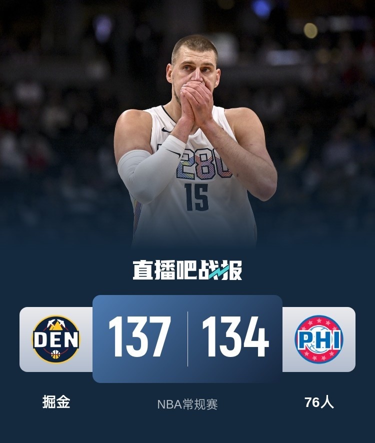 开场后掘金就围绕约基奇打得有声有色,约基奇不仅自己能够拿分,还不断为队友送出助攻。不过76人外线手感出色一波三分雨一度将比分反超,随后场上局面陷入僵持。第二节上来两队在外线对飙三分,穆雷凭借个人能力接连砍分,乌布雷毫不示弱也连续回应。易边再战,掘金多点开花率先将分差拉大,马克西开启得分模式单节轰下16分为76人紧咬比分,亚布塞莱也依旧在内线活力十足。末节决战,马克西继续利用速度优势杀入内线拿分,关键时刻约基奇内突外投连得11分,76人最后采用犯规战术,穆雷两罚稳健,76人超远三分不中,最终掘金137-134力克76人结束3连败,76人4连胜被终结。