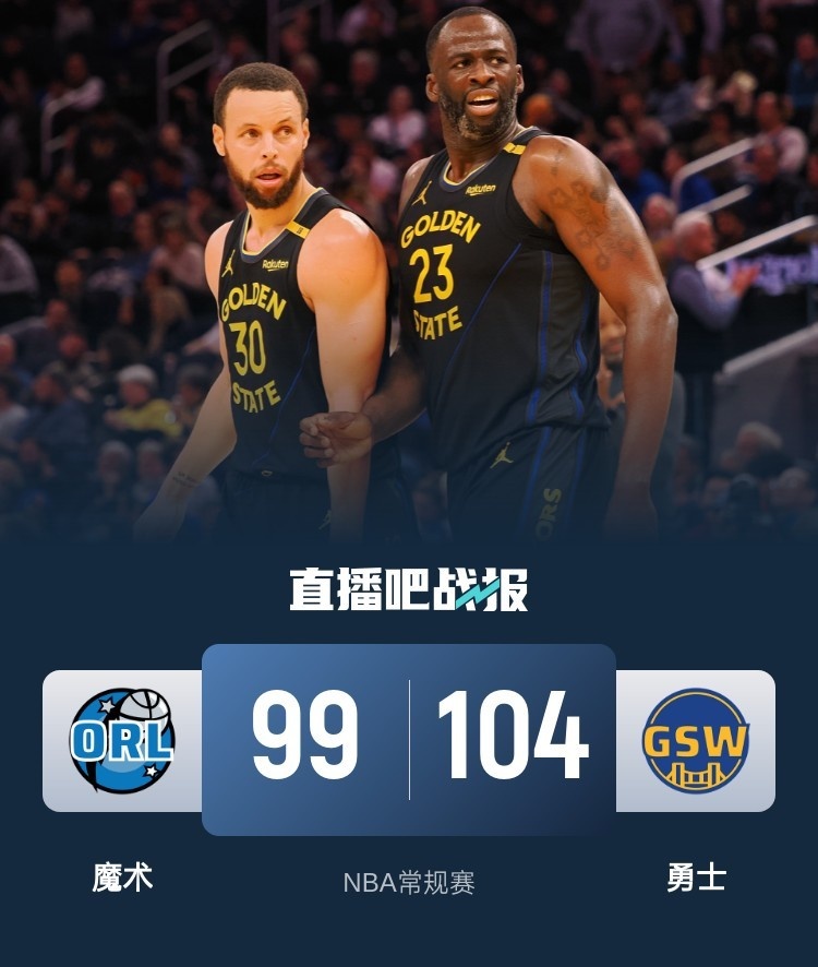 比赛开始,勇士全队表现慢热,魔术连投带罚占据场上主动,次节魔术命中率下降,勇士多点开花迫近比分,维金斯强攻扳平比分,半场战罢勇士43-43战平魔术。易边再战,魔术进攻端仍无起色,库里和波斯特连中三分带队取得两位数优势,班凯罗连续拿分苦苦追赶,施罗德连中三分强势回应,末节小瓦格纳率队打出23-8反超比分,勇士连续拿分重夺优势,魔术无力回天。最终,勇士104-99击败魔术,主场过关。