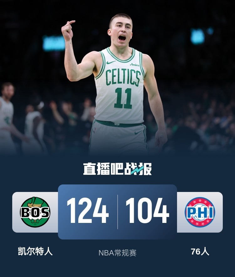 比赛上来,凯尔特人就占据了场上的主动权,一波9-0的小高潮迅速取得领先,76人虽然有追分的势头,但分差在首节末段还是达到了两位数,次节凯尔特人依旧攻势不减,单节再次打出36-28的比分,半场结束时76人落后16分;下半场回来,76人的表现更加糟糕,单节得分未能上20分,三节结束时分差已经达到了26分,比赛在末节已经早早失去悬念,最终凯尔特人大胜76人,迎来四连胜的同时也送给后者六连败。
