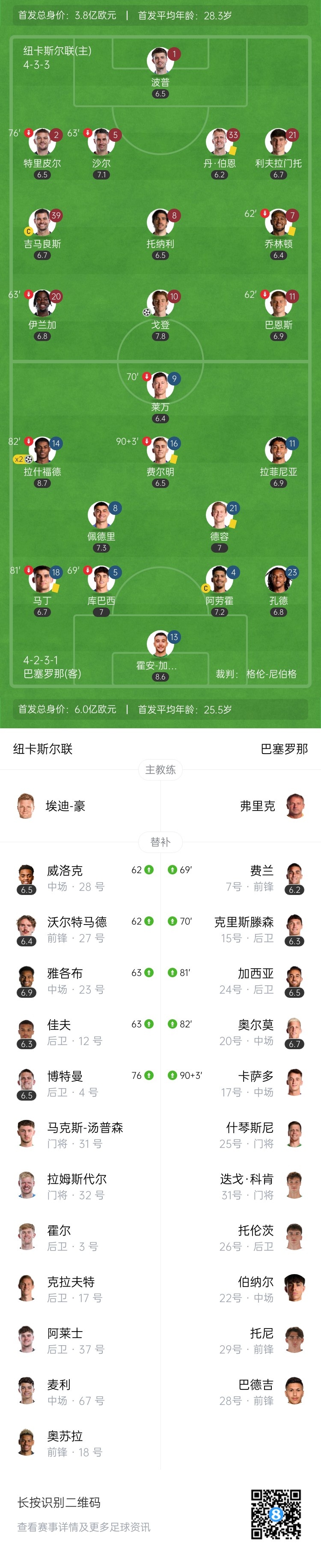 全场比赛结束,巴萨2-1纽卡斯尔。