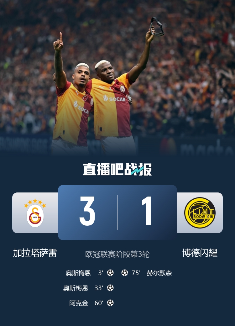 10月22日讯 北京时间10月23日00:45,欧冠联赛阶段第三轮加拉塔萨雷迎战博德闪耀的比赛在土耳其电信竞技场进行,上半场勒米纳助攻奥斯梅恩闪击得手,随后奥斯梅恩抢断后推射扩大比分,菲特远射中柱,下半场阿克金补射再下一城,奥斯梅恩失单刀,赫尔默森头球扳回一城,最终加拉塔萨雷3-1博德闪耀取得欧冠两连胜。