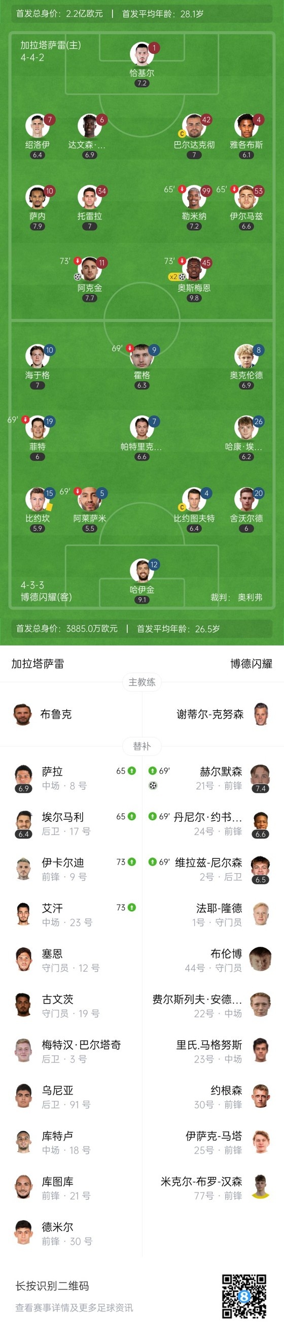 下半场补时4分钟,加拉塔萨雷3-1博德闪耀。