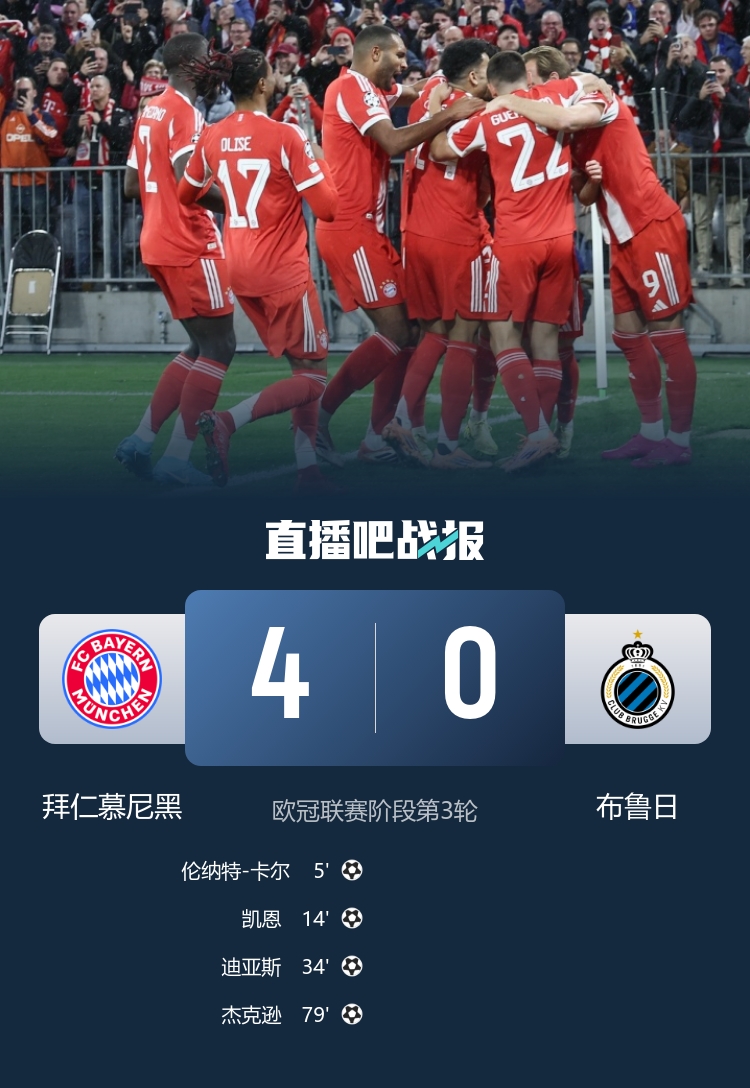 全场比赛结束,最终拜仁4-0布鲁日。