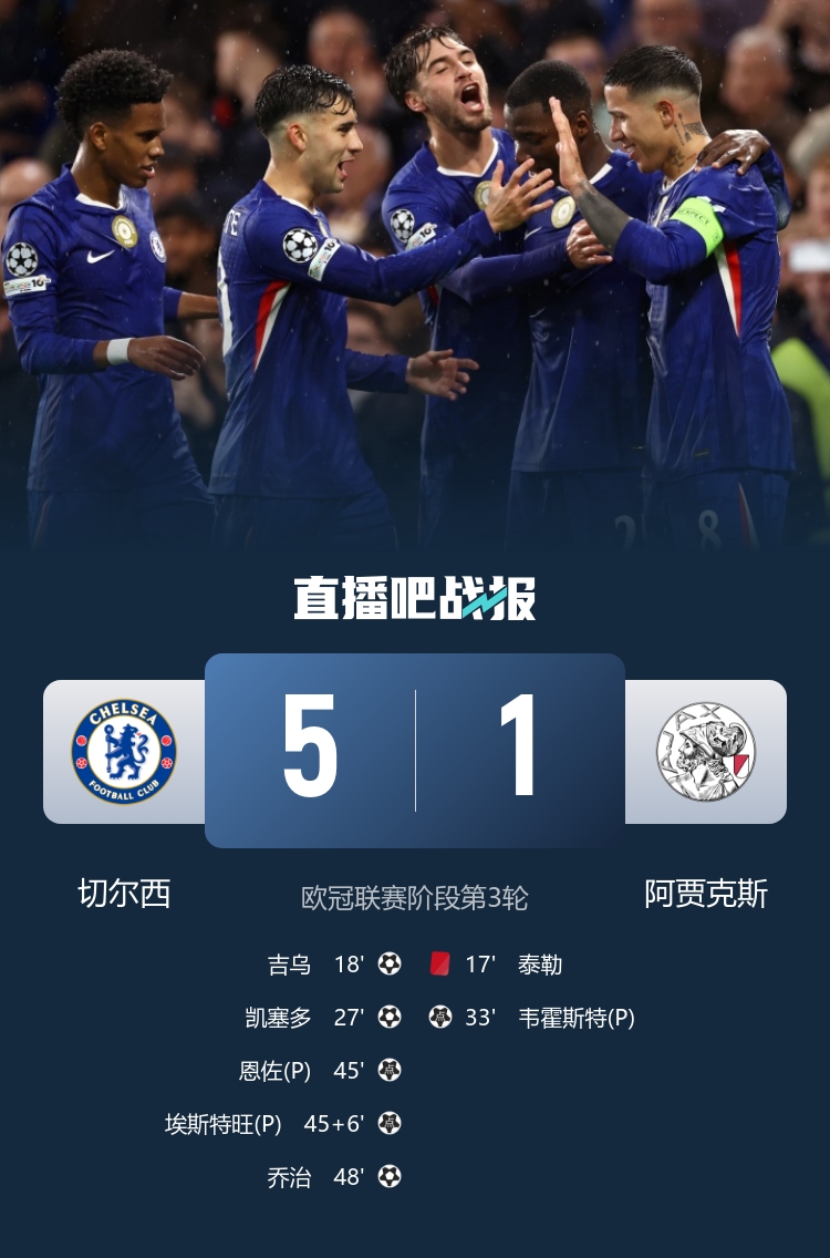 四连胜!切尔西5-1十人阿贾克斯 恩佐、埃斯特旺点射凯塞多建功