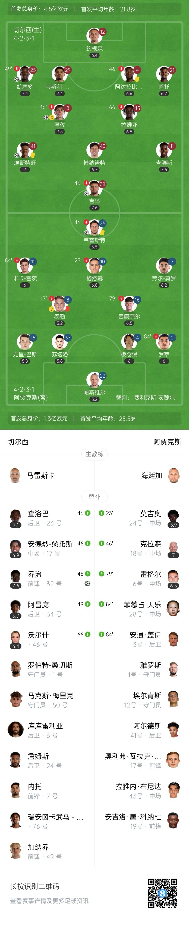 全场比赛结束,切尔西5-1阿贾克斯。