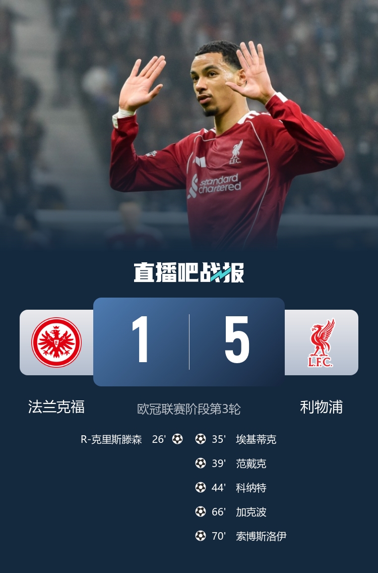 全场比赛结束,利物浦客场5-1逆转法兰克福。