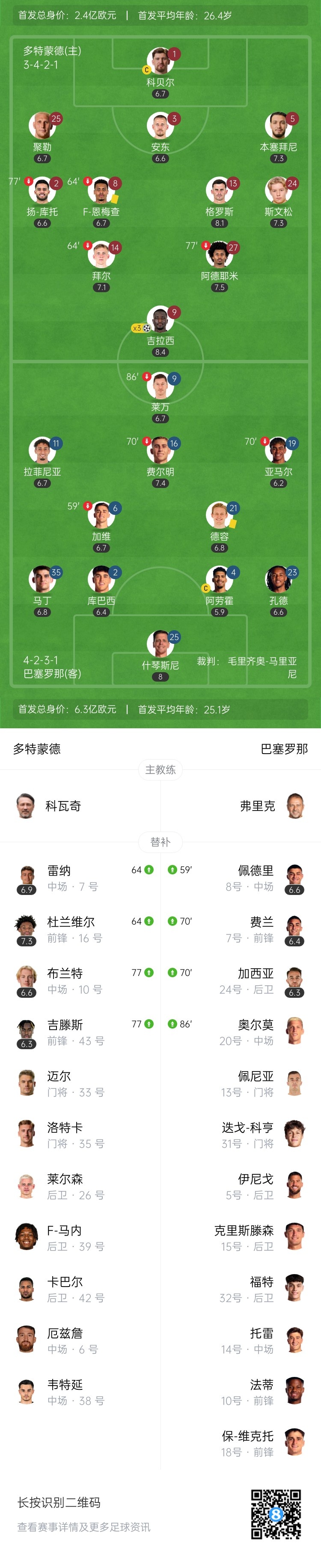 第55分钟,中场位置孔德送出穿透性极强的直塞,费尔明右路跟进低平球传中扫到禁区,本塞拜尼回防不慎自摆乌龙,多特2-1总比分2-5巴萨↓