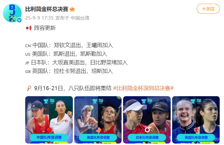9月9日,比利简金杯官宣郑钦文退出,王曦雨替补代表中国队出战。此外,大坂直美、凯斯和拉杜卡努三位大满贯冠军也退赛。