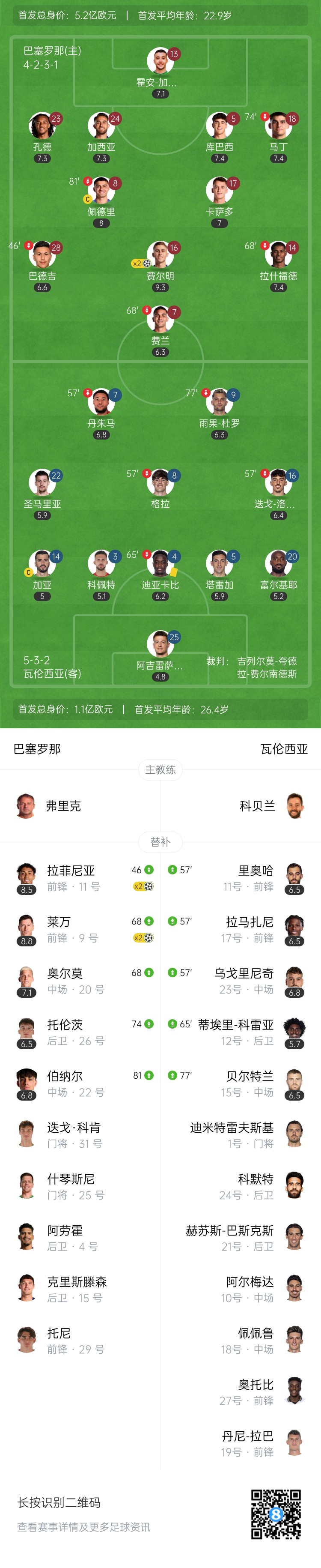 第86分钟,奥尔莫弧顶外送出直塞,莱万跟进挑射入网,但第一时间边裁举旗示意越位在先进球无效,VAR介入后确认进球有效,巴萨6-0领先↓