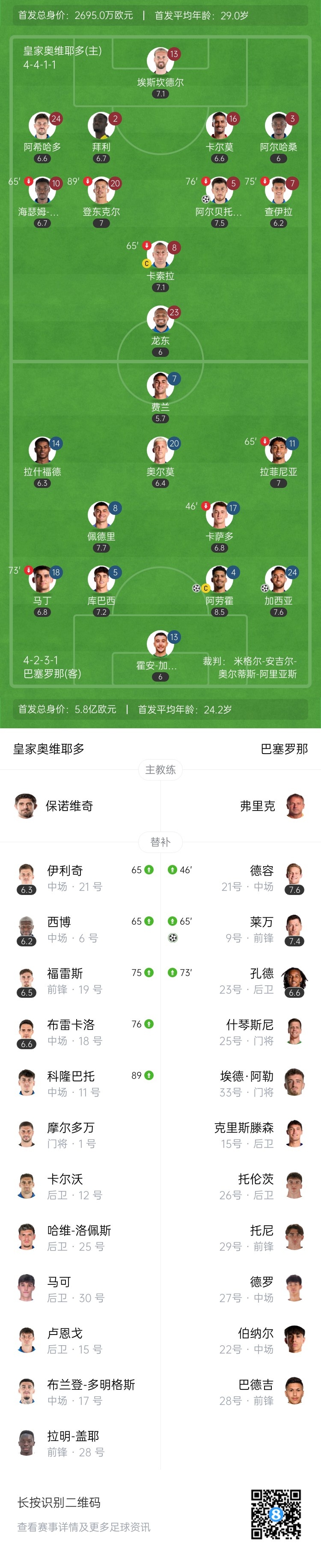 下半场补时5分钟。最终全场比赛结束,皇家奥维耶多1-3巴萨。