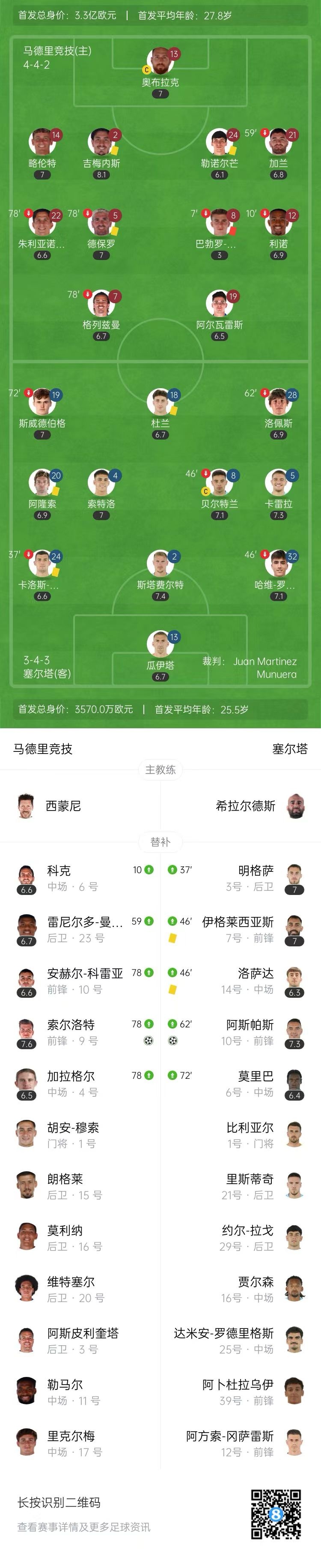 第81分钟,马竞长传反击,索尔洛特单挑后防,胸部停球顺势过掉防守,一脚抽射将球打进,马竞扳平比分,1-1!↓