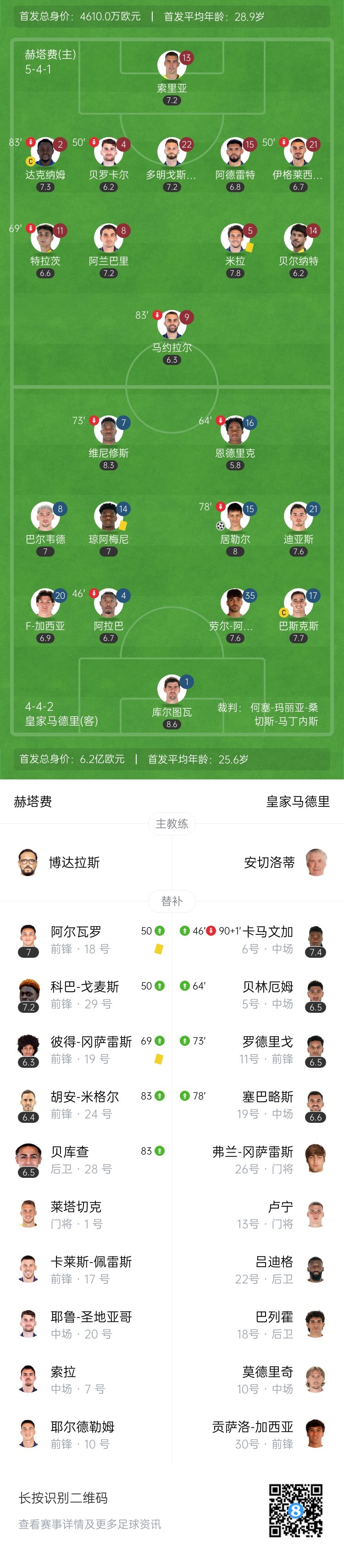 下半场补时6分钟。最终全场比赛结束,赫塔费0-1皇马。