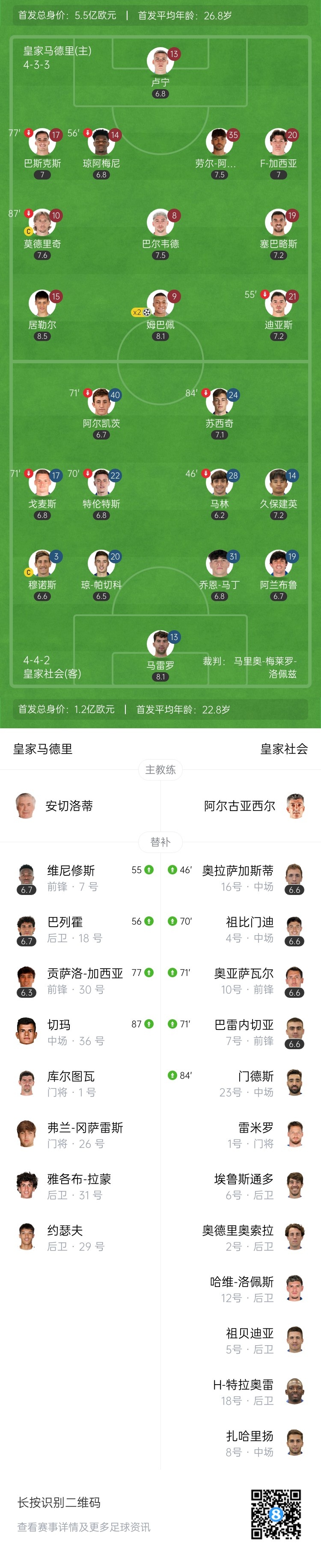5月25日讯 北京时间5月24日22:15,2024-25赛季西甲联赛第38轮,皇马坐镇伯纳乌球场迎战皇家社会,本场比赛是皇马主帅安切洛蒂前往巴西队之前执教白衣军团的最后一场比赛,也是莫德里奇的主场告别战。上半场卢宁扑出对手单刀球,居勒尔禁区内挑球过人造点,姆巴佩点射被扑但补射打进,皇马暂1-0皇家社会;下半场卜拉欣-迪亚斯伤退,姆巴佩小角度射门再下一城,最终皇马2-0皇家社会,赛季第二收官。
