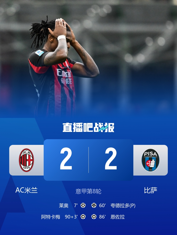10月25日讯 北京时间10月25日凌晨2时45分,意甲第8轮,米兰坐镇圣西罗球场迎战比萨。上半场,莱奥首开纪录。米兰半场1-0领先比萨。下半场,德温特手球犯规送点,夸德拉多点射破门,随后恩佐拉破门反超,阿特卡梅替补绝平。最终米兰2-2战平比萨,各项赛事连续8场不败,本轮先赛的情况下,米兰暂时2分优势领跑意甲。