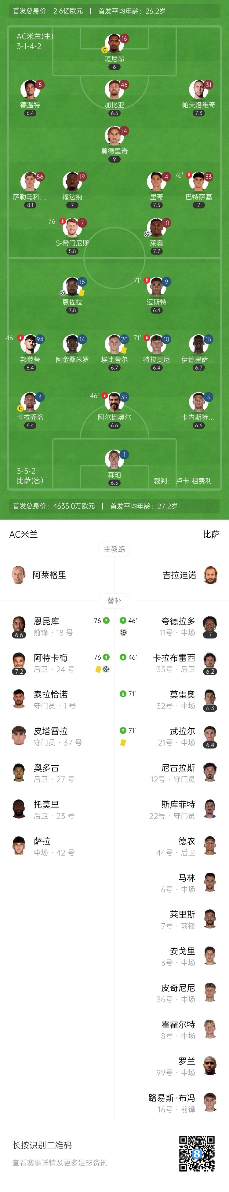 第70分钟,米兰开出角球至禁区内,后点加比亚头球攻门,球被门将扑出,随后比萨球员解围,萨勒马科尔斯禁区外围得球后起脚远射轰出一记重炮,门将飞身将球扑出底线!↓