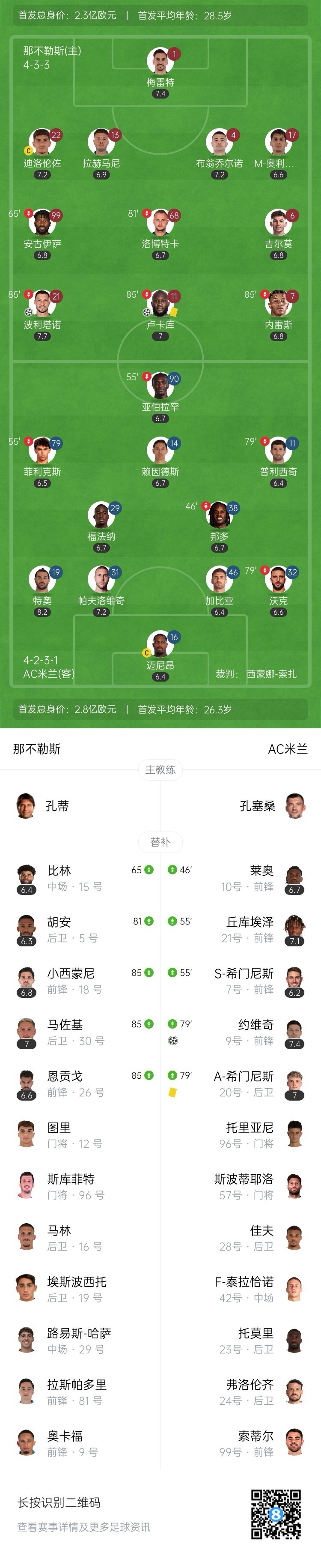 约维奇替补破门迎赛季首球!米兰扳回一城!第84分钟,莱奥直塞,特奥插上横传门前,约维奇包抄抢射得手,那不勒斯2-1AC米兰!↓