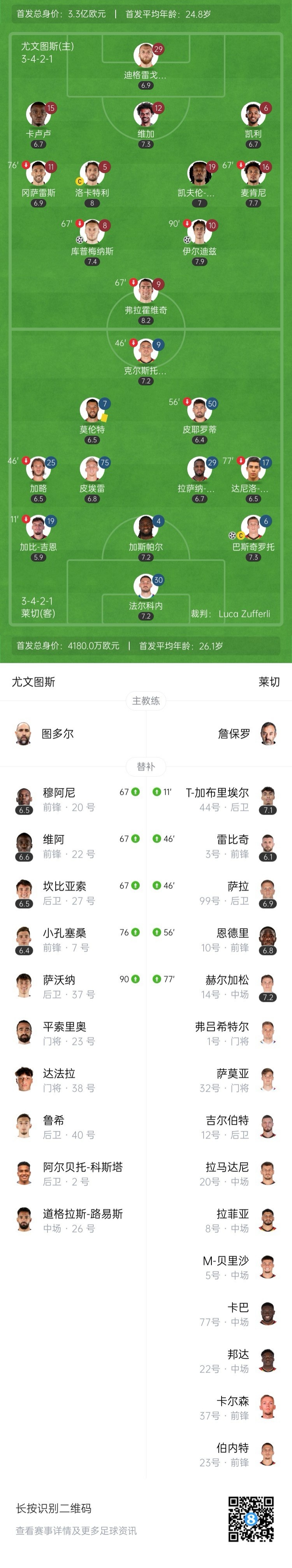 全场比赛结束,尤文2-1莱切。