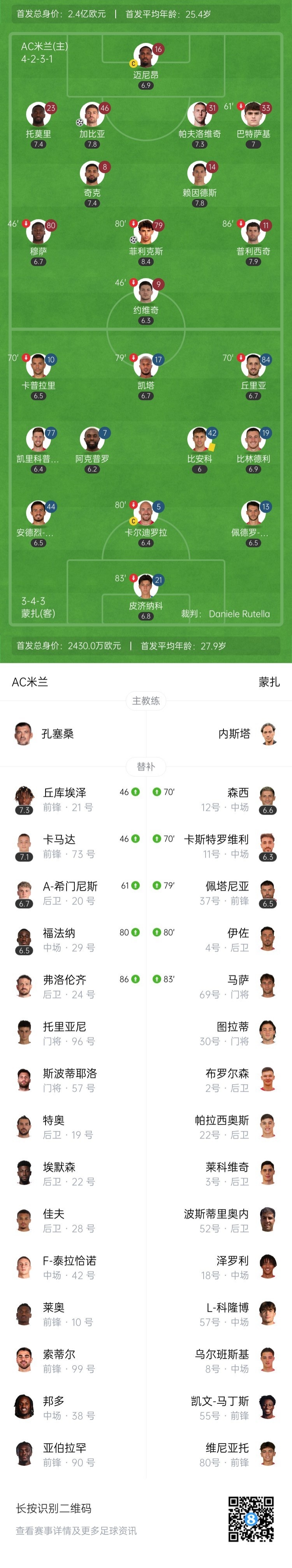 第74分钟,菲利克斯制造禁区前左侧任意球机会!自己亲自来主罚!皮球越过人墙打进球门左侧!米兰2-0领先蒙扎↓