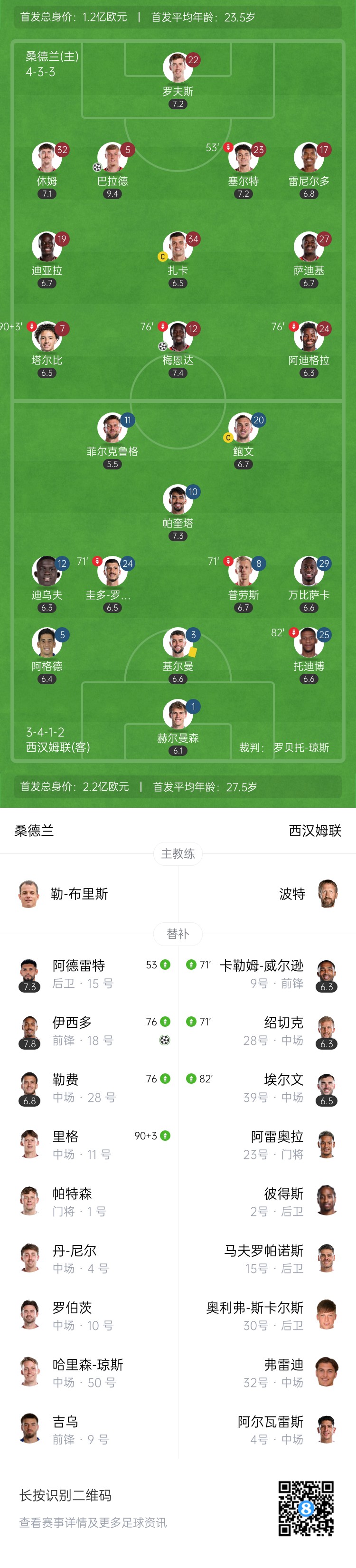 比赛第73分钟,阿迪格拉边路传中,巴拉德头球再下一城,桑德兰2-0领先西汉姆联!